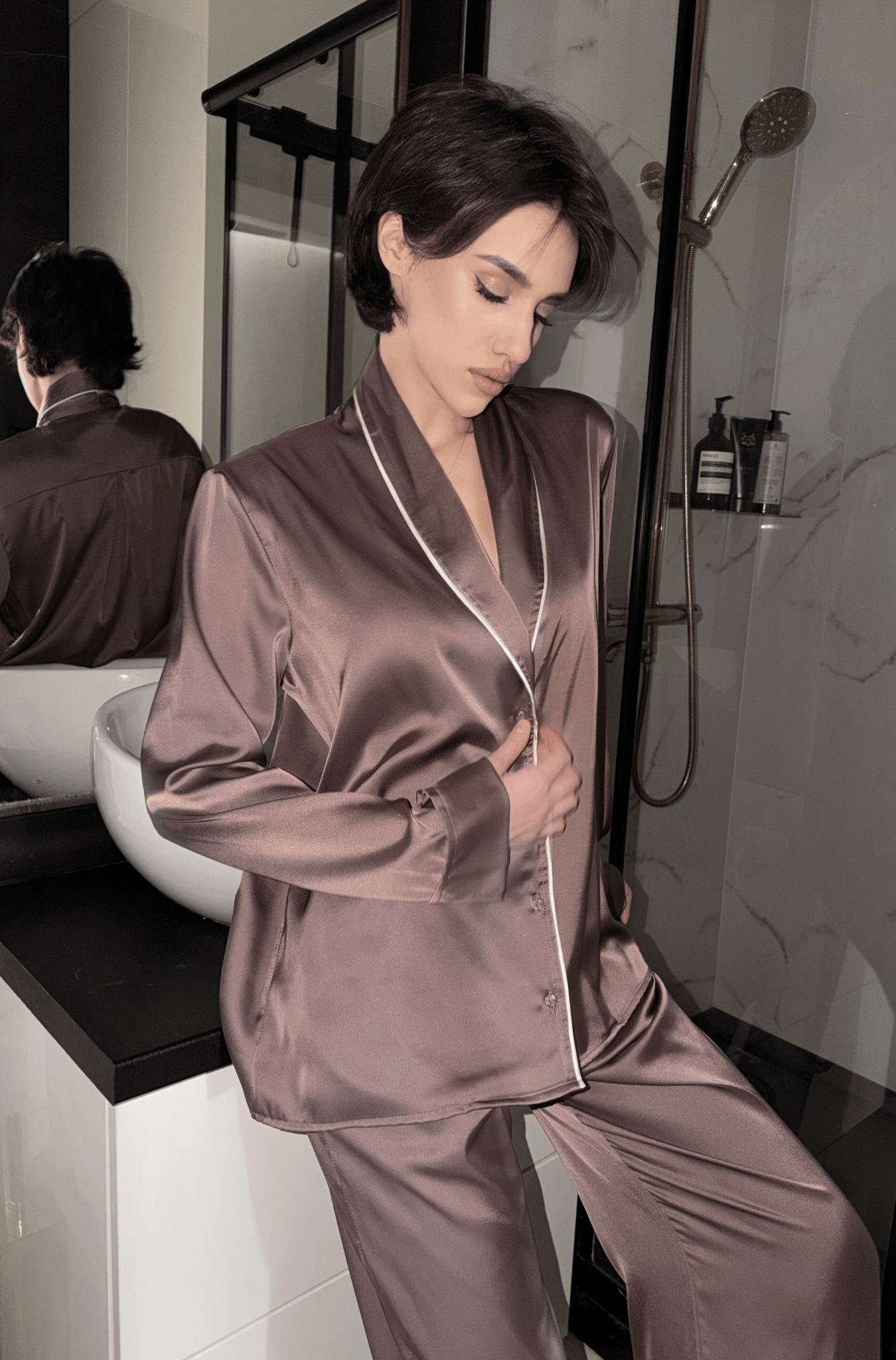 „Annabel“ mokos rudos spalvos ilgas pižamos komplektas